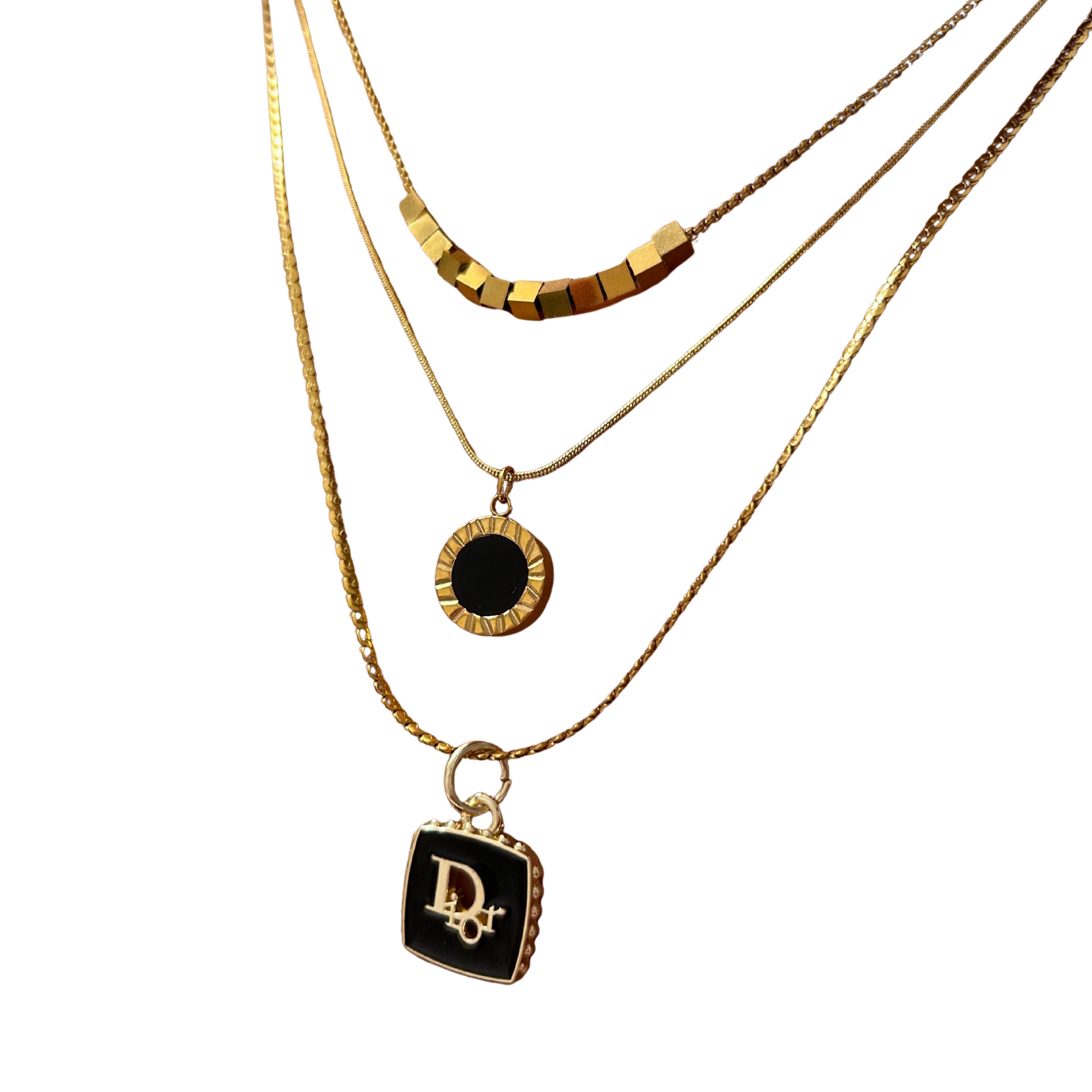 Your new statement piece - This double necklace features an upcycled Dior pendant with double sided natural shell charm and sleek black acrylic accent. Chic, sustainable, and oh-so-stylish — a timeless revival that blends iconic design with modern layering trends.